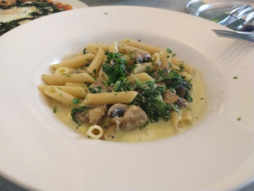 Main: Penne with Mushrooms and Spinach and Pizza with spinach and an egg in it. Very good flavours in the pasta dish but the sauce was too thin, likely because the spinach seemed too wet! You are not supposed to be able to splash the sauce especially when the pasta is Penne! Pizza was terrible. Uncertain if a particular style but no crust, base was very uneven with poppadoms thickness on one side and naan thickness on the other, sauce was super dry and flavourless and it was topped with what I suppose were caramelized onions but they were still raw (translucent). Again lacked any salt.