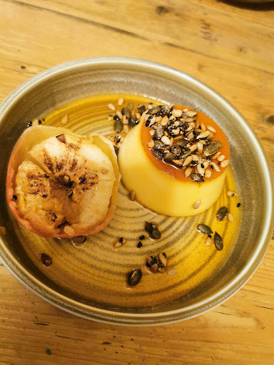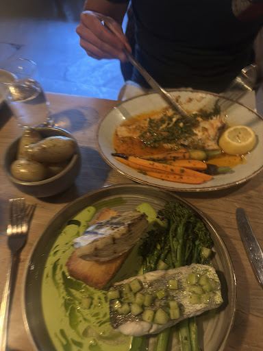 Read moreWe enjoyed a really delightful meal here last week at the beginning of half term. We are local but shamefully it's the first time we've been! Tables were time restricted but we didn't feel rushed at all - we enjoyed three courses in the time allocated and felt the courses were appropriately spread out. My husband had the Octopus and Bone Marrow which he said could potentially be up there with his best ever starter. As a pescatarian who sways towards vegetarianism I did not oblige đ I did however thoroughly enjoy the Mushroom starter on sour dough toast with a delightfully light creme fraiche. I find Mushroom starters can often be overpowered by garlic but the flavours on this starter were really well balanced, not too rich and not too filling before a main. My only slight critism was the toast was slightly over done but it didn't bother me enough to mention it. My husband enjoyed the "fish of the boat" which was a very nice monkfish with dressed kale and potatoes. I enjoyed the fish and chips - the peas and jalepeno tartar were particularly nice. Triple threat chips (really feel they should be renamed this) were excellent. Portions were really quite large - I couldn't finish my portion. My plate was void of oil which was excellent for me. Can't stand an oily/fatty fish and chips - it was cooked to perfection and not remotely dry. A very good piece of fish. We cautiously ordered desserts (as we were getting a bit full!) but I'm very glad we did! I had the nicest Creme Caranel with baked apple and toasted seeds. It was incredible. Staff were excellent, attentive and genuine. There was one lady who was particularly impressive, she had a great character about her and I admired her attitude towards waitressing, she seemed to genuinely enjoying herself and her interactions. Sadly didn't catch her name. Last slight critism, I was sat on a bench that wobbled quite precariously at the slightest of movement đ kept me on my toes though. Decor is traditional so I'm not overly surprised by a creaky bench.