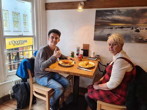 Text: Would just like to say I moved to salisbury last week My mum visited me today. we stopped for some lunch I had medium battered cod and chips.