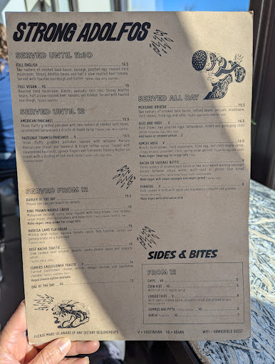We visited Strong Adolfos cafe a couple years ago. It was so brilliant, we couldn't wait to go back. Obviously with a Pandemic we have had to wait, and it was well worth it.They were extremely efficient with the Covid restrictions, and made us feel safe. The staff are very friendly, and work very hard. The Cafe is decorated really nicely, it has a relaxing friendly vibe. The background music was reggae, which makes you feel happy. The food may seem a little on the expensive side, but, when you eat there, you realise this is no greasy spoon. It has more of a restaurant quality. Lots of locally sourced ingredients, It feels like a real treat. An unusual menu, full of variety, innovative flavours, and colours. A lot of thought has gone in to the menu. I had the burger, chips and salad. This does not seem out of the ordinary I hear you say? Try one!! The salad is fabulous, chips are tasty, and the burger, Wow!! The bun is light and fluffy, the beef patty cheese, sauce and pickle combination is magic. I'm always full, so never have sweet, which is a shame, as the cakes look scrumptious. Which is why so many people buy them...