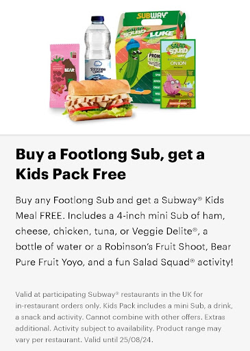 Read moreAfter going through the tedious process of making a full footlong and a kids sandwich, I got to the till to be told the free kids meal offer only works with the subway app. I haven't got the app installed on my phone and the phone reception in the shop is really poor to install the app. I was advised by Bradley and Peter to go by the window and install the app while other customers were waiting in the queue. I had another look at the free kids meal offer sticker in the shop window and it doesn't say anywhere you need the app to access the offer (not even on the small print nor subway website-see photo attached).When I challenged this, they insisted I need the app even though it doesn't say on the advert, because these are the rules. I then turned down the order and left. Really disappointing service as they didn't even try to resolve the issue. The sticker with the free kids meal for every footlong bought is still in the window and might mislead other customers in the future. Shame for the wasted food and...