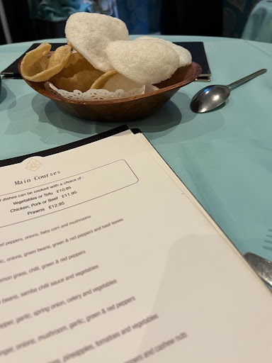 Read moreFirst visit. They seated us half an hour earlier than our booking. Restaurant very small. Tables were practically touching! Interesting colour of mint green for serviettes and table cloths. Thai red wine was delicious and smooth. Thai and prawn crackers given complimentary but no sauce. Thai crackers had a distinct fishy taste and a kick of chilli at the end. Crispy duck and pancakes - duck was extremely crispy (hardly any meat) and too many pancakes for two people. Chicken penang curry was the best but a little watery as we had it with noodles. Vegetable golden noodles and stir fried green veg were delicious. We finished everything! Jasmine tea at the end was a lovely finish. Service was a bit naff. One particular waitress was just standing there staring at us, whilst the other workers were all busy doing their jobs. We had to ask for more drinks. Very expensive...