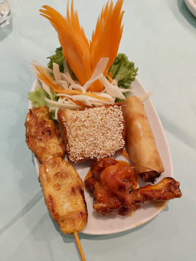 You get a mixed starter to begin with. Really really delicious. The satay is not dry and the prawn toast is really really packed with filling.
