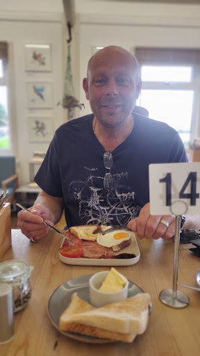 We sat indoors due to rain, dogs are allowed. Order and pay at the counter then it will be brought over to your table when ready. Kept very clean, beautiful food, have gifts to purchase and the staff very friendly and welcoming. There is a small play park outside for children, the car parking has to be paid for at the machine before entering the café as you are on the property where you can fish, walk etc you will need to have an idea how long you will be staying for. Toilet facilities are not in the café but in the block of buildings outside, we didn't use them so cannot comment. In my powered wheelchair I could get into the cafe and my husband just had to move a chair at a table for...