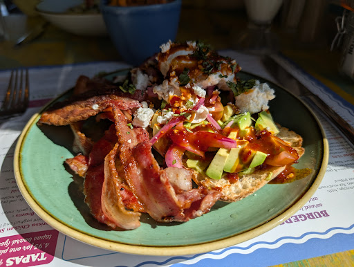 Read moreLocated next to Lidl on the main road, we spotted Teatro as we drove by initially thinking it was a tea shop. We managed to find parking in a nearby residential side road but be aware there isn't any parking for the venue itself. When we entered, we were met with a surprise. Not just a tea shop but a surprisingly big quirky lively bar/restaurant/coffee and tea shop rolled into one. Set out over 2 floors with an outside terrace area upstairs and lots of different seating areas. Visually, it was amazing. Arty, fun colourful. I noticed all ages. Families with children well catered for as well as older people. It's accessible for wheelchairs and pushchairs on the ground floor, but a flight of stairs is needed to access the first floor. I took my 84 year old Mum who uses a walking aid, and she loved it at Teatro. It was clearly hugely popular but we managed to locate a table in the window from which we could watch all the comings and goings. There are also tables outside, although expect a view of the road and traffic noise from steady stream if cars and shoppers coming and going from Lidls next door. Staff very friendly, but they seemed very stretched and were running around trying to see to everyone. It was a weekend, and lots of people had descended for lunch. Being gluten-free, i was given a specific menu, which was helpful, and overall, I found the staff attentive to any kind of allergies, if a bit anxious. I had to order at the bar rather than have my order taken at the table, which meant waiting in a queue. We waited some time for our order to arrive, but when it came, the food was good. However, my hummus order came with an enormous helping of hummus (nice) but very little bread to go with it. Drinks were all good, and there's a wide range to choose from, including cocktails. I had a non alcoholic one, which was very tasty and refreshing. The menu is worth a visit and caters to all, including vegetarians, vegan children, and guests with allergies. There's a range of tapas and burgers, too. It's the kind of place that's informal but fun. You can just as easily order a cuppa and cake as you can a full meal. Prices are good, and our lunch for 2 with drinks came in at £22. We would like to visit again. The main drawbacks are lack of parking and what seemed like a lack of sufficient staff, which led to delays. However, I would add that the staff on that day were helpful despite being rushed off their feet. We would visit...