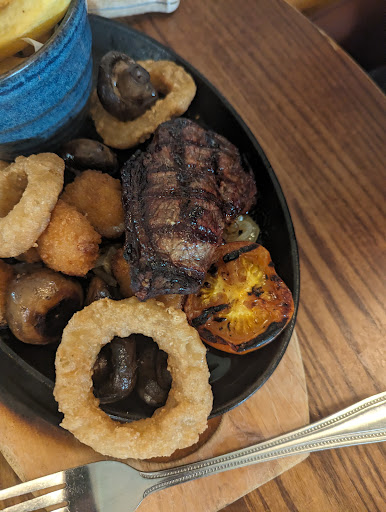 Will not attempt to eat here again. Waited 40 minutes for our food when the place was nearly empty and people that had ordered after us had already been served, requested on plates and came out on skillets (no big deal) paid for an upgraded option on a meal which hadnt been done, no sauce came with the order - when complained was told that it was not the managers fault and that food takes time! Not the response you want when your starving! The other half of our table ordered steaks aswell - 2 gammon steaks came out 10 minutes later which was wrong at which there was still no sincere apology and the answer was well I'll get 2 steaks on the go but you'll have to wait. At this point we had decided to ask for a refund as there was no complimentary extra or money off the bill offered and with the blatant lack of concern and couldn't care less attitude from management we were highly disatisfied. Within minutes of leaving we got a phonecall from the other party to say that their order had been rejected because of our attitude towards management! Absolutely pathetic! Under new management - will be needing new management if this is the way they want to...