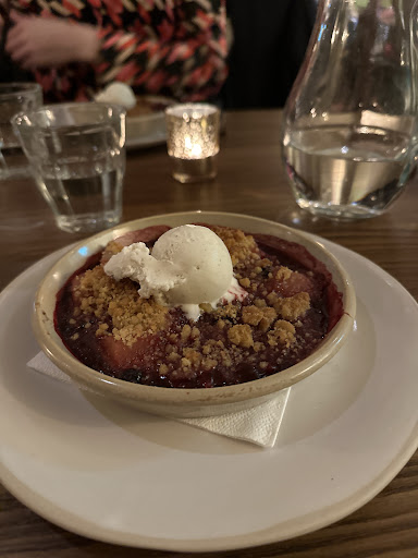 Onto desserts: I'm a fan of souffle IF done well. After the experience of the main; I suspected we were in the presence of a chef or set of chefs who seriously know their craft, so with anticipation ordered the pistachio soufflé and Julia ordered the apple and gooseberry crumble. Neither of us had seen, let alone eaten gooseberries for decades. We eagerly anticipated our desserts.