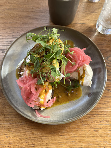I opted for the Turkish Eggs (Poached Eggs | Garlic infused Greek Yogurt | Harissa Oil | Basil & Pine Nut Pesto | Sourdough Toast), which came in at a reasonable £8.00, it arrived in a reasonable time frame, was well presented and tasted great (perhaps a little too much garlic).