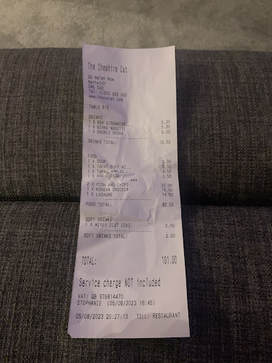 Read moreHi, We booked a table for four people tonight at 18:30pm and I must say the level of service has really gone down hill! To start off with when we first arrived my partner went to get us all drinks at the bar downstairs and three young female staff were stood down at the end of the bar talking to each other. My partner had to ask the Bartender to get their attention to serve us two to as he was busy serving other customers. We went upstairs as we had a table booked for 18:30pm only to be greeted by a female staff member with a love bite on her neck that was very prominent. She then realised she couldn’t operate the laptop because she was new so we were greeted by another new member of staff. We started ordering our food and my partner asked three times not to put hot sauce on the chicken wings and for sweat chilli on the side. The waitress confirmed that she understood. The appetisers took ages to arrive and when they did there was hot sauce on the chicken wings. We asked another member of staff to who seemed more experienced to replace the wrong order. She proceeded to inform us that there were 4 trainees on tonight who had only 4 day’s experience. When the replacement chicken wings came it was really greasy! We then waited until after 8pm to eventually get our four main meals and Unfortunately the hand cooked chips were rock hard on two of the fish and chip meals and were white in the middle like they had not been defrosted. No one came to the table and asked how our meals were or to offer anymore drinks. My partner flagged down the same waitress that we assumed had more experience to inform her of the quality the chips who offered to get more chips however my partner had finished his fish as was not prepared to wait any longer after waiting for his starter to be re cooked. After that conversation We waited and waited and we could see the staff in the staff area talking and no one checking on tables! There were empty glasses on numerous tables which we found very frustrating. We then got up as no one came with the bill or apologises or a discount and went to the staff area upstairs to ask for the bill. Very unprofessional and disappointed as we had a quest over from Thailand and we chose your restaurant as one of the best in the area. Not the Cheshire Cat experience we...