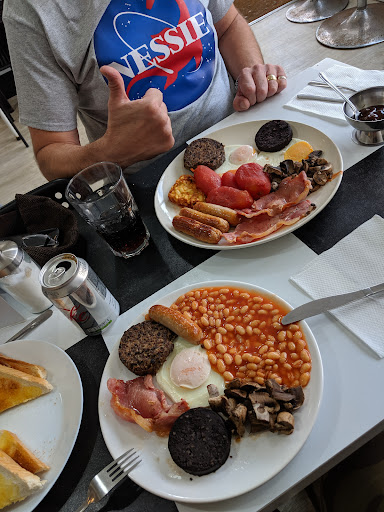 Read moreDOG FRIENDLY Fantastic value, tasty food (fry ups but also an assortment of sandwiches, panini, jacket potatoes, cake), but the real star of the show is the hospitality. We got a very friendly welcome as soon as we arrived, table service, and flexibility with the menu to accommodate my desire for haggis on a small breakfast! Clearly a popular spot for locals of all walks of life - families, solo diners, couples, seniors - and our dogs were welcome to sit in with us rather than having to wait in the car, which is a BIG plus for us (surprised how few places in town are dog friendly). Will definitely be stopping in again....