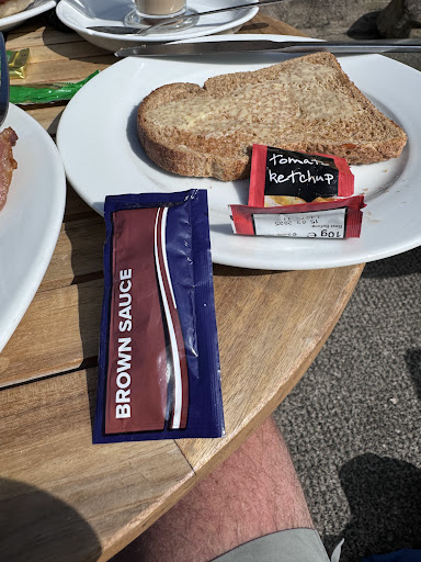 Decaffeinated coffee options available , along with being dog friendly( which is always a plus +). Breakfast served in a timely manner ( with friendly staff ). Full English was served with generic brown toast ( single slice ) . Eggs Benedict was served on a bread roll - not a muffin . And used back bacon instead of ham ( unusual combination ), but worked very well . Only concern was the use of generic plastic condiments, awful tasting ketchup and brown sauce ( Hard to open these plastic sachets - especially if you have mobility or manipulation issues ). Fortunately this did not detract from the overall enjoyment of this breakfast in the courtyard ( weather was...