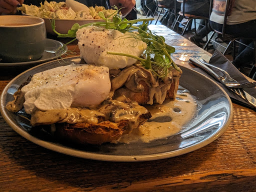 Two of us came this morning for breakfast and coffee. The service is outstanding, attentive staff but not all over you, we asked for another few minutes to look at the menu as they were keen to take our order upon arrival. They were more than happy to give us a few extra moments to decide. The menu is right up my street, not pages and pages of different things, a very good selection of quality breakfast/brunch dishes along with sandwiches etc. I had creamy mushrooms on toast with additional poached eggs and my partner in breakfast craving crime had smashed avocado on toast, again with additional poached eggs. The food arrived a matter of minutes after ordering and was absolutely delicious, a very hearty portion of a dish done exactly how I wanted it. The atmosphere was superb, itâs a medium sized busy dining area and you donât in any way feel in the way or on top of other people which was very nice. The cake/desert selection is top drawer and we took some...