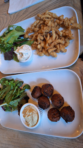 But from initially choosing an outside table we quickly changed to eat inside as blaring music and charging children running between the tables. We chose an interesting starter of crispy duck fries and were so disappointed to be presented with a bowl of soggy French fries and barely a teaspoon full of duck. Not worth the price or expectation. But never mind we thought as we were buoyed by the prospect of âPosh fish and chips" with monk fish and petite pois. What we were actually presented with were another oversized portion of french fries dominating the plate with just 3 finger sized pieces of monk fish scragg ends in a heavy, soggy and heavy batter. Along side this were a small portion of overcooked microwaved petite pois. Overcooked so much they had sunk in on themselves. Definately not worth the ÂŁ15 for the main course let alone what the starters cost. The manager seemed uninterested and we paid full price and left unsatisfied and incredibly disappointed. Luckily for them, the table of guests next to us saw our food and commented and left without ordering! In summary a lovely location but not good for food or customer service. We left and bought a second meal for the night at The Bell in Addington, with amazing food and silver service. Many clients travel from London to the Bell and we now wonât be trying...