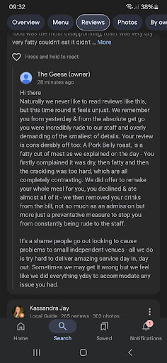 Where shall I start, hard dry potato's, the pork belly was so fatty, half was given to the dog, the rest left, the veg was just cabbage and carrots, the Yorkshire pudding was over cooked and like cardboard. I ordered cauiflower chesse, this was burnt. The chicken and gravy was very nice so not all bad. But after leaving a review to be attacked and accuses of being rude and basically troublesome to the staff is totally unprofessional, my partner wanted a tea, which they don't serve, so don't bother asking. I left the pub and bought tea bags from the local shop and even gifted them to the pub. Our issues were met with hostity, although we were offered a replacement that was kindly declined and as apparently as way to stop us being rude to the staff my cider was not charged for. SMALL PUB VERY NOISY, certainly not a relaxing meal. I would have left this, but to be told you are extremely rude due to being unhappy with something is an awful response. £45 for 2 average roast and an awful after experience is certainly not worth it. At no point were my partner or myself rude.