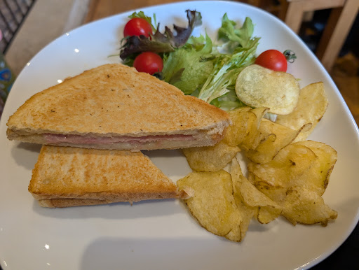 Ordered some delicious looking cakes and cream tea for the kids, all giving a big thumbs up. I looked at the specials board and went with a simple cheese and ham toasted sandwich in white bread. Served with a side salad and crisps. Nothing special but also nothing wrong with it, all tasted as expected, freshly made with a pleasing cheese pull without totally burning my mouth.