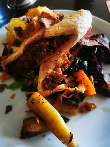 The vegan Wellington was just super. Three massive roast potatoes, savoy cabbage, braised red cabbage, beetroot, carrots, roast parsnips and parsnip crisps, with 2 generous slices of Wellington in a flakey pastry. The gravy was served on the side, which I really liked, as it meant I could attempt to tempt my kid into trying an actual vegetable. And also because I'm a fussy bint with gravy placement! The entire portion was enough to place me in a very happy food coma.