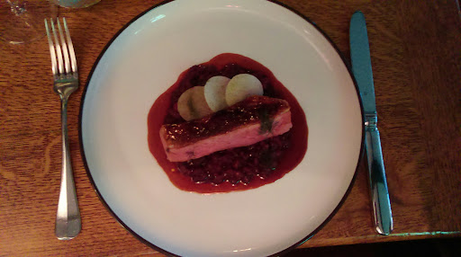 Now for the important part, the food. I started off by ordering a Scotch Egg. I'd never tried one before and it sounded interesting. It was really good, though I have nothing to compare it to. My wife started with the Tea smoked salmon and I have to admit that was the first disappointment. It was good quality smoked salmon, but it was nothing special and not worth the price. Also the bread and sides it was served with were nothing remarkable.