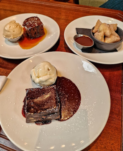 For dessert, we ordered three options: sticky toffee pudding, triple chocolate brownie, and bombolone (mini doughnuts). Unfortunately, the sticky toffee pudding was dry, as if it had been reheated in a microwave. On the other hand, the brownie was rich and gooey and the bombolone were soft and fresh.