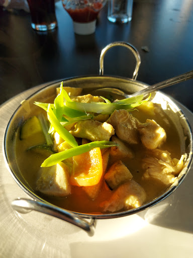 This place is a bit like sitting in the local community hall, with outdated chairs. It lacks in atmosphere, but with a revamp could be amazing. I found the food to be too salty for me and slightly overpriced, no menu just a blackboard to choose from, which is fine. Service is a bit on the slow side, with only one person serving, cooking and waiting tables, we was offered compensation of an additional dish, which never arrived. Bottled beers only, nothing on draft, a little on the warm side too.