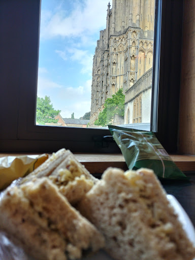 We couldn't afford to go into the Cathedral so I thought we could make a donation by paying a visit to their café. The entrance is well sign posted but we initially missed the stairs on the left which takes you up to the dog friendly seating. There is a lift for those who might need it.The very nice toilets are located on the right. It's a very nice room and they offer simple fare at reasonable prices. It wasn't busy but that can quickly change We had coffee and cake but unfortunately my Victoria sponge was very dry and the fillings were thinner than a bus ticket, it wasn't pleasant. The wife didn't do much better with her elderflower and something cake. Portion wise she got the runt of the litter. There's a small selection of quality drinks in the fridge and as it was a warm day I thought I would try a relatively local beer. This was the highlight of my visit. Lots of large tables in the room were occupied by couples which is always annoying but I couldn't see any tables for two so I guess they had no other choice. The table cleaning lady was the most engaging member...