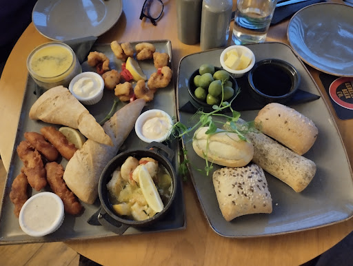 We were quite disappointed with the value and quantity of food, particularly for the prices charged for the bread sharing platter and seafood sharer. The bread sharing platter was £9 for just four rolls, accompanied by olives of very poor quality—honestly, we've had better from a corner shop. The seafood sharer, while tasty, was £23 and consisted mostly of deep-fried items, with only the prawns and a smoked pâté providing non-deep-fried variety. It was far from substantial; had we only ordered that, we would have left hungry. Calling the seafood and two slices of ciabatta a “sharing platter” felt like an oversight.