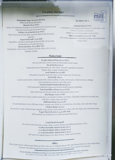Read moreWe found The Mill Race on a spur of the moment search for a Gluten Free Sunday Lunch and it was a real gem! My partner is a Pescatarian and gluten intolerant and it was so nice to be able to go out as a family for a Sunday Lunch and be so well catered for. I had the large 3 meat Sunday roast which was delicious! My partner wanted the vegetarian nut roast, but it was one of the few items that couldn't be made gluten free. There were still extensive options though and she had the Cod and Roasties (pictured) she said the fish was amazing. We shared a lovely selection of vegetables including gluten free broccoli cheese. Even the carrots had been laid out nicely in the serving dish. Our children had the Chicken Goujons and chips and the portion was big, they both ate it all which is a rarity! The inside is stylishly appointed and you can see into the kitchen which looked clean, well organised and well run. All the staff were very polite and courteous. I would definitely recommend The Mill Race for Sunday lunch, especially if you are...
