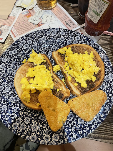 Ordered a vegan breakfast at approximately 1135 am(1 slice toast, 1 sunflower spread, 2 sausages, 1 tomato, 2 mushrooms, 2 hash browns, baked beans)with 1 extra hash brown, refillable drink and water. Only cost approximately £6.56. I helped myself to HP sauce, salt and pepper which are located next to the hot drinks machine.