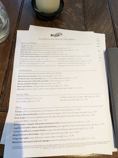 Read moreThis is a beautiful Pub with lovely flowers at the entrance, along with a great friendly welcome at the door. Unfortunately The Nelson wasn’t quite up to its usual standard yesterday! In terms of food The mushroom risotto 3 out of 10 beef strips was an ok ! Both the chicken saltimbocca’s were Very Dry, frozen inedible fries on the side and a limp and odd tasting salad. Hamburger had a taste of tuna ! The pork definitely wasn’t very appetizing either. Children’s Mac and cheese no flavor as we had to season it with lots of pepper for an 8 year old and the hamburger was not good according to a 12 year old. I honestly came to the conclusion that the chicken, hamburger and pork could only be so dry because it had been cooked hours before! juicy and succulent we’re definitely missing here ! We ate the meal because we were very hungry but Very disappointed. YesI did want to send mine back but I didn’t want to embarrass my son as he was introducing his new girlfriend and we had a friend over from Switzerland. We ordered dessert thinking what could go wrong!!! The staff were attentive and friendly but did lack in their surroundings to check on us to see if we needed drinks or if everything was OK, we had to try and get their attention most of the time. I have recommended this pub to others before and that’s why we came. But I won’t...