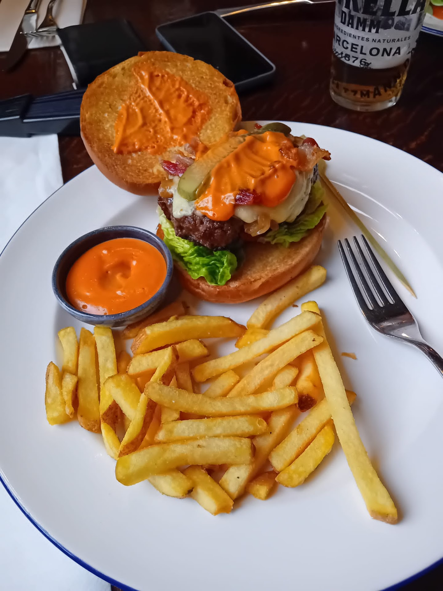 We won’t be going there again for a meal, as besides having to share the space with dogs [towards the end of our meal, we had a very large German shepherd and collie at the table next to us].the meals were mediocre and overpriced, £16.95 for a beef burger and a mean portion of chips .