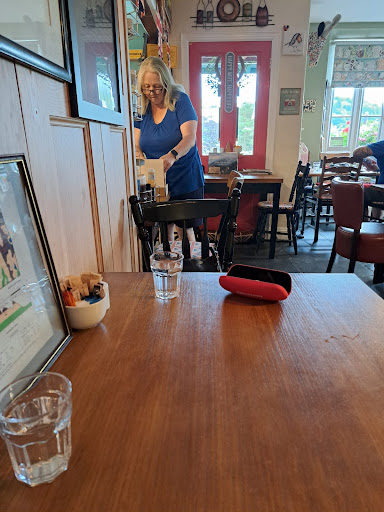 Read moreWe visited on a particularly drizzly Sunday, on a stroll from where we were staying for the long weekend. We arrived dripping wet with a soggy dog, to the cosy, warm tearoom with the fire burning but no free tables. Luckily a table was just getting ready to leave so we were able to sit soon after arriving. We ordered coffee, hot chocolate and cakes, all of which were delicious and well presented. I particularly enjoyed the scone with jam and cream, and my wife's hot chocolate was so generously sized that I ordered a second flat white whilst she was still drinking her first drink. The other food looked delicious, would definitely try other things from the menu on another visit. Staff were friendly and helpful, greeting our damp dog and telling stories about some of the interesting decor, after we were amused by the cuckoo clock's chime. Definitely a perfect place to enjoy a treat and warm up on a damp day, but also well suited to a refreshment stop on a warm day, with the outdoor seating. We were also impressed to see a range of essentials for sale, perfect for those staying or...