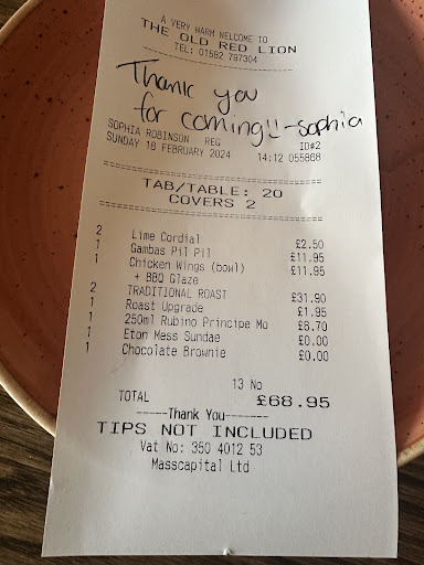 Ā Ā Ā Read moreFriendly staff.. but sadly the food quality has gone down since opening.. the waiting times r ridiculous.. came in for breakfast awhile back and had to wait about half hour for our coffees we asked twice.. then 45mins later the breakfast arrived and was nothing like what iv had previously there.. then the other day i went in for carvery but Ā£17 was ridiculous for what was there.. then i was going to order a dessert and drink.. but was told i cudnt because they were closing the kitchen although it was only 8pm.. and the carvery was still out.. the girl i spoke too was very polite and shes served me there b4 and was lovely.. but the food standards seem to hav drastically gone down theres no love put into the food nomore and the long waits r really puttin people off and its never that busy so i dnt understand the waiting time and im certainly not the first to hav a lil moan bout that.. lovely pub decor wise since being completely renovated.. some nice staff but jus very over priced for the quality of food u get.. which is a shame tbh bcos i know thats what puts many local people off going there and they then choose the local italian restaurant instead.. or chequers (were the foods jus as bad lol) but prices r cheap for familys.. this pub is jus in the wrong location for the menu prices.. the old red lion was a complete dump 𤣠inside b4 the new makeover but was always still busy!!! Cos the prices were reasonable.. where as wen u got there now itās literally jus the bar staff and kitchen staff in there! I dnt understand why they dnt try to reduce the food prices.. also no ale on tap.. yet it...