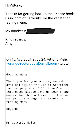 I booked our table at The Orange Tree in mid August. My original request was whether they did a vegetarian tasting menu - I did not ask if they could make us one specially. Vittorio confirmed that they did and asked for details to book.