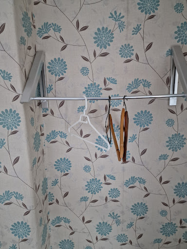 There is a makeshift pole on the wall to be used as a wardrobe.