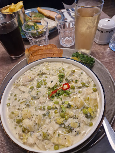 Read moreWas looking for somewhere to have lunch on a very busy day in midsummer, and found this friendly little restaurant away from the crowded harbour area, in a shopping street close to the parish church. I managed to get a table next to the window. Lovely friendly waitress who welcomed me as soon as I walked through the door, and polite and attentive service throughout my meal. It's a cosy and homely little place with comfy blue banquettes, lots of little ornaments, and flowers on the tables. There's another room upstairs, plus clean toilets and baby changing. The restaurant as a whole was very clean, with tables sanitised between customers. There's a well stocked bar with a good choice of beers, cider, gin, cocktails, and wine, as well as hot drinks. Ordered half a pint of the local Cornish Orchards cider, and it was really good and refreshing. The lunch menu included a wide choice of locally and freshly caught fish and seafood dishes, as well as burgers and a few vegetarian options. I had a bowl of clam and crab chowder, served with bread and a lemon slice. Flavourful and filling, with big chunks of crab meat, clams slightly chewy, lots of potato, leeks, peas and herbs. A simple but satisfying lunch, and very reasonably priced. Would...
