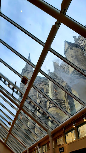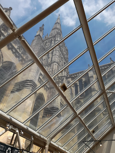 Had lunch here after a visit to the cathedral. There are tables out in the cloister but I ate inside. They do soup, sandwiches and light meals as well as cakes and cream teas. Counter service was quick despite the café being busy and the food was not too expensive. Had a vegetable quiche with green salad, tomatoes and red cabbage. The quiche was more warm than hot but it was tasty and the pot of tea was good and strong. Admiring the architecture of the cathedral through the glass roof while I ate was a great bonus! There's a nice shop at the far end of the café where you can get stained glass paperweights, tapestries, jewellery and other gifts and toys inspired by the cathedral, as well as some...