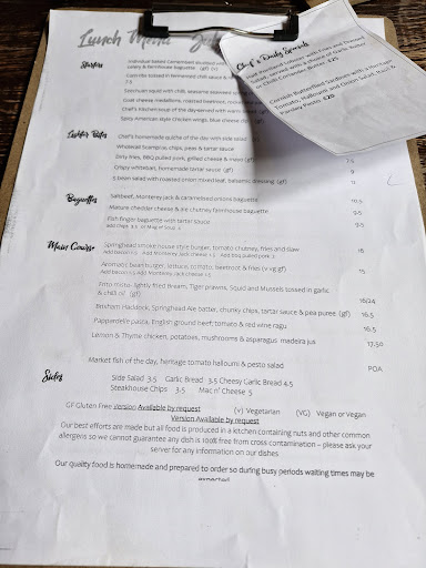 Read moreDelicious food, varied menu; a warm welcome; great setting. We had a super evening at Springhead and one of the nicest meals we've had for a good while. The setting is wonderful, looking out over the stream/river and watching the ducks and their ducklings. Hours of entertainment! The garden looks over hills and fields and the surrounding area is lovely and quiet. The chef has been at the pub for ages and I feel that's a great sign for a pub/restaurant. I knocked off a star for 2 reasons. The back garden, whilst have a good view of the countryside and the horse carved into the hill, wasn't wonderful on the evening we were there. Just a little tired at the time but perhaps the sign of a busy lunchtime? There are some things being built around, a stage/scaffold in the garden from memory. It was the end of the day and perhaps it's more of a daytime place...but something didn't feel quite right so we moved to the front and were really happy. I imagine there would have been times where the garden would have looked more beautiful and the atmosphere would have been nicer, so please don't write it off - it was simply our experience on a particular Saturday evening. The other thing was the fact that we were really looking forward to a coffee after the meal only to be told the machine had been turned off. We'd have loved to have been offered while it was turned on. We were thoroughly looking forward to rounding off such a wonderful meal with a coffee and a liqueur. But hey, all in all it was a great night and the staff were very happy to cater for us when we arrived late due to getting lost on our walk!! (we called to let them know and the young lady we chatted to was really lovely) If I'd had the option of 4.5 stars, I'd likely have given that instead. Lovely pub, great food, great location, friendly staff and well worth a visit. If we're back in the area we'll definitely return and we recommended it to some fellow campers who also had a lovely lunch...