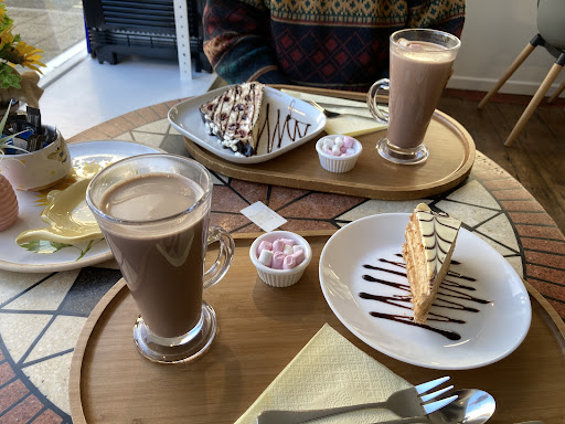 We called quite late in the afternoon but there was still some choice of delicious cakes and the best Hot Chocolate with marshmallows I’ve had for a while. The proprietors were very welcoming and aaccommodating to those requiring a gluten free diet. The Esterhazy almonds with hazelnut meringue was such a special treat. The atmosphere was very calm and relaxed spotlessly clean and tastefully decorated, sunflowers of course and exquisite handmade table decorations