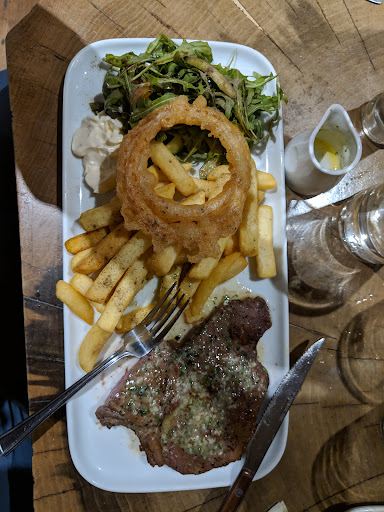 Steak was cooked perfectly medium rare but was quite tough, onion rings seemed very greasy, frozen chips (why?!), garlic butter and side salad was good tho!