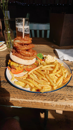 The menu we had for lunch was fairly basic and we went for the burgers. The vegetarian burger was one of the best I've had - grilled peppers and halloumi with the perfect amount of ancillary ingredients, it was really tasty. The side salad was more than just lettuce, coleslaw was good and the chips were good too (just too many of them). The onion rings were super crispy and tasty but too rich and oily to manage all 4. The reason I'd not give 5* for the food was because my husband's cheese and bacon burger was kind of dry and very salty. I tried it and the veggie burger is way better even if you eat meat. The pub interior is quite nice but also a bit tatty around the edges which is a shame as exposed foam on the seats brings the...