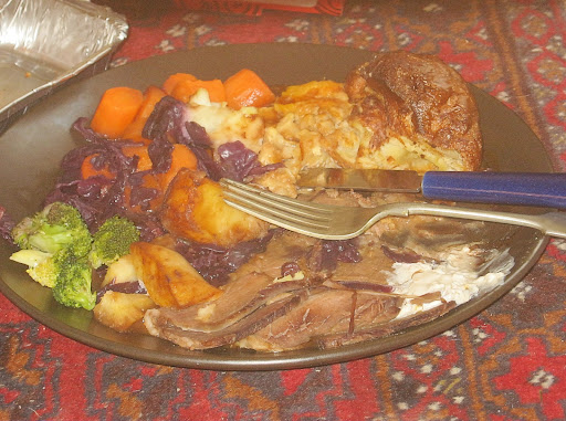 So I got a delivery on Sunday of a roast beef lunch; I was hopeful based on the web site but had not girded my loins sufficiently for this fayre. It arrived in different tin foil cannisters some with vegetables from the table of the Harvest festival itself - red cab, broc, carrots, snips, cheesy cauliflower, roasters and mash - and others with half a calf's worth of beef and Yorkshire pudding.