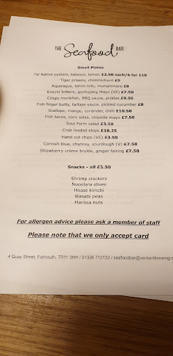 We were so excited to try here whilst holidaying in Cornwall, saw online they didn't accept reservations so popped in on the off chance last Tuesday, they accomodated us at the bar but there was quite a wait for menus and drinks but that was ok due to their good reviews and atmosphere. I spoke about my allergy, the young lady on the bar wasnt aware what one dish was (raw/cured fish) which my partner would not have chosen if she was given this information (maybe she was new as was quite young) my wife never received the dish due to ridiculous wait times and the mess ups with my order. They were out of the Fal oysters so I had to have the other, which however was fine, they also were out of the Mackerel, alot of things they have sold out of, which is probably because they are rated so highly. I was asking if I could have the scallops without the milk (caper butter sauce) and then to come back and tell me it wasn't made with milk, when I pointed out "butter", anyway they substituted it for a salsa verde. What was most disappointing is they served me the allergen I had made them aware about, there was a long wait for food as well which we were aware (on the taco's), the chef shouted over the pass that he forgot and had put milk in the dish!! I had almost swallowed and had to spit out the food. For someone with a serious allergy or a child this could be life threatening. When the waitress asked him had he made a replacement about 20 mins later I think he had forgot and then they had ran out of that, another member of staff let us go when we said we will just pay the bill and leave, she decided to waiver it. We were so disappointed as we visited here after the main brewery on the industrial estate, probably should have stayed there and had pizza. Verdant is my favourite craft beer. My suggestion is you accept reservations especially if customers have allergies and most have travelled a long way to allow them to experience. Quite disappointed as we had saved a visit until the end of the holiday for a special treat, and by time we left there was no where else for food that night which completely ruined the end of our holiday as lots of places had stopped serving food by this time. My suggestion is if you have an allergy BEWARE as milk allergy should be treated the same as a sesame or a...
