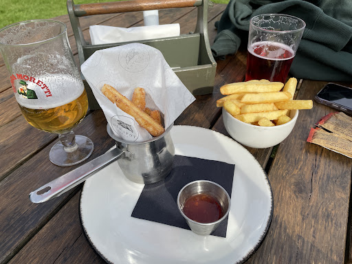 My wife & I ordered the cod & chips, and when it arrived the fish was noteworthy because it was the most dense, thick & heavy batter I have ever seen on any kind of food. While it was dry to the touch, the fish was so stiff & hard it made an audible thud when I whacked it against my plate, to the amusement of our friends who were thankful they didn't order the fish. Honestly I could have used it as a weapon! I wasn't really able to cut into it easily, having to use more force than should have been necessary. The fish was okay, but that batter was not. The chips were at least double cooked in oil, possibly even triple cooked, and they were pretty good.