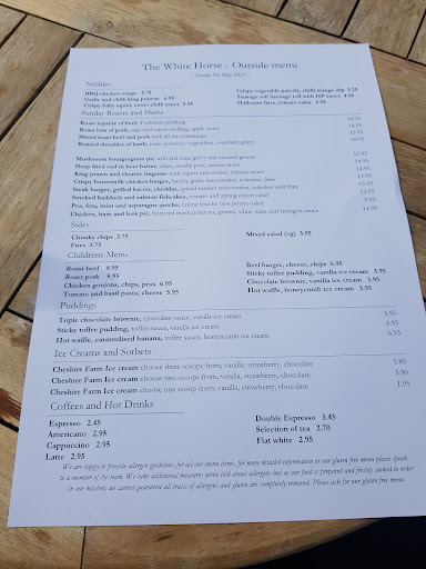 Read moreWe visited on a Saturday late lunchtime. Good choice of dishes on the menu. And a nice choice of ales for the hubby which he thoroughly enjoyed. Lovely atmosphere and decor, friendly staff and very good C-19 measures which they have worked hard to get right. We ordered king prawns and halloumi fries for starters. Prawns were excellent, fries a bit underwhelming. Mains were ribeye steak and duck breast. Both were presented well with nice accompaniments, but both the beef and the duck had little flavour. The duck was also overcooked and served upside down (skin side down, soggy in gravy) in two, 2cm thick slices. We had to have a word about the duck as it was left half eaten, and the courteous and friendly manager took it off the bill. Puds were good; a superb brownie and a passable sticky toffee pudding. We've eaten in this chain of pubs before and had better food, with a more home-cooked feel. The White Horse has so much going for it and a good position in Beaconsfield. It would be an outstanding pub if the kitchen could raise its...