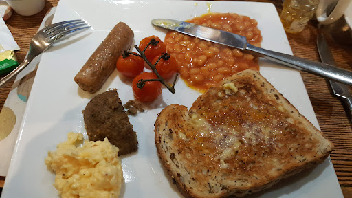 Read moreFirst of all I want to make sure that the staff know that they are AMAZING and really did everything to make the stay as great as they possibly could. The main issue we had was with the evening meal. |We were very excited for our trip away, getting out of the city for a night, and the main reason we chose to stay here was because we saw on the menu that they had vegan options, and itâs hard to find rural pubs with rooms that have this option, usually we have to drive somewhere for dinner, and reading the reviews we were really excited for some lovely home cooked pub food before a comfy nights sleep.|We arrived to a really warm welcome and lovely open fire, after a rainy walk close by and were taken up to our wonderfully spacious yet cosy room, had a lovely hot bath and even got some beers from the bar. |We went down to the bar and had a drink before dinner by the fire which was really lovely. We were shown to our table in a nice cosy corner and sat down. We ordered 2 Falafel Starters and 2 Banana Blossom Mains and asked if we could have some bread and oils as well.|The basket of bread arrived which was just 6 small shop-bought bread rolls, balsamic vinegar (on its own) and vegan margarine, when we asked if there was any olive oil for dipping we were told there wasnât any in the kitchen, which made us a little concerned about how our salad for the starter was going to be dressed, however the starters arrived and looked really appetising. But, the falafel was cold, shop bought and dry, the salad wasnât dressed, and there was a smear of tahini was at the bottom which is also very dry. The raw chickpeas and bits of beetroot were the only moisture on the plate. Iâve never been served raw chickpeas, they donât have much flavour, maybe roasting/toasting the chickpeas in some spices would have helped? Olive oil would have been a massive bonus and frying the Falafels or baking them just to help get rid of some of the dryness would have helped a lot too, this mixed with the dry bread served with just vinegar was a disappointing start to the meal. However the mains were much better, the banana blossom was tasty and lovely chips served with vegan mayonnaise, just would have liked the mushy peas to have a bit more flavour, again they tasted shop bought, but it was a lovely sized portion for the price. |The atmosphere was absolutely lovely and the staff were excellent and we made sure to tip them as, again, none of the above should reflect poorly on them. We didnât mention anything at the time as we didnât really speak about the starter until we got to our room and by that point we were full of chips and ready for a cosy nights sleep. |The next morning we headed down for breakfast and they gave us some vegan yogurts that felt like theyâd got in specially for us which was absolutely lovely. And the vegan cooked breakfast was tasty, could have maybe done with a veggie sausage or something but other than that it was really...