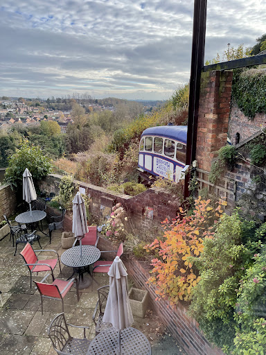 The quirky little venue starts with a winding staircase to what looks like a lovely tea room. Then if you go further down you can sit on a patio area beside Bridgnorth's famous cliff railway and watch the world go by.... well the train at least you can't admire the view as the wall's too high. 🤨