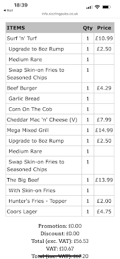 Read moreBar staff were very friendly. Length of time waiting for food was over an hour. The restaurant was very quiet but the time it took for our food to be served was very slow. We had to ask where the food was no-one came to apologise or advise there was a delay. When the scampi and chips arrived the chips were dark brown and soggy, obvious to anyone they had already been cooked then cooked again, the scampi was dark brown in colour and even going black on places of the batter, it was barely edible the whole meal was lukewarm. When mentioned to the waitress she actually put her hand onto the food to feel how hot it was! My husband's sausage and mash was lukewarm too. Given the amount of time we had to wait we would have expected the food to have been fresh and hot. This is the second time in as many visits at this time of day on a Saturday that this has been an issue. Given the fact that it was a quiet late afternoon and no apparent reason for the delay or being advised of the delay when ordering food I expected better. It is highly unlikely that we will visit this establishment again. We used to go frequently at lunchtime on Fridays although we stopped due to poor service. Understandably Friday lunchtimes are busy but to only have 3 front of house staff including bar staff in a full restaurant meant that tables were not cleared on time and exceptionally long delays on kitchen times usually over an hour for even just a wrap meant we stopped visiting and changed to late afternoons on a Saturday when it is a very quiet time, unfortunately we find the service is no better and the quality of...