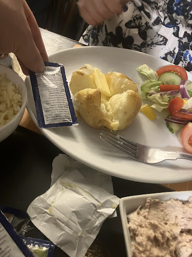 Wow . Possibly the worst eating out experience I’ve ever had . We called on a whim . My partner is gluten intolerant and this place offers possibly the worst choice for her . A jacket potato! The spud was tiny and cold inside as was my daughter’s. Obviously not microwaved long enough. She was served a giant bowl of Tuna mayo and cheese. I tasted the tuna and was definitely past the 3 days life it should have after opening. Obviously using it up rather than chucking it out . I had the ham egg and chips . I really wanted fish and chips but bizarrely for a pub near the coast they don’t serve it . My ham eggs and salad arrived. Then when the waitress returned with me granddaughters food my chips were tucked up in her armpit ! If your staff can’t carry 3 things safely for gods sake send them with 2 . Oh let’s not forget the Pepsi max that was flat . The granddaughters pizza was clearly a microwave one . Oh I almost forgot my ham was sliced the wrong way . With the grain not against it meaning it was virtually impossible to cut with a normal knife. The side salad was fresh and tasty , about the only thing I can say for it . We all left hungry to find something else to eat after paying nearly £60 for 4 of us and no one’s food being right . Avoid this place if you have any hopes of enjoying your food . Picture of my partners spud with a mayo...