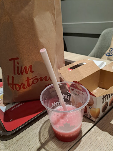 Read moreMe and partner visited the Tim Hortons in Golden Square Warrington around 15:30 today which is a Sunday. It was our first time at this particular Tim Hortons, I've never been to any Tim's full stop so this was my first experience. When we arrived it was busy but not rammed, there was a queue for food 'collection' which was awkwardly set up as there's not enough room to form a neat organised line and you end up waiting around people's tables and there's a table in the way of collection also. So that side of things was a bit awkward and the self serve machines were in the middle of the entire room which I'm adamant doesn't work in food places but they keep doing it. They could be against a wall on one side as a suggestion like some McDonald's do but I digress. As we'd never been we used the self serve to figure out what we'd like and the menu's were clear and simple, but it was so we could go and order in person as I have a blue light card. The man said Tim's accept blue light but kindly mentioned the deal/offer they had on today worked out cheaper so we appreciated that. The food came quick and came hot and we liked the idea that the burgers came in foil as it possibly kept them warmer for longer. I got a meatless chicken sandwich meal and my partner got a chicken sandwich stack meal and we could not fault it the burgers were delicious. Thanks to the deal, for 2 meals it cost us just under £15. All in all we had a good first experience and on this visit would recommend. The low rating for atmosphere was due to the self serve machines and collection point being where they are, when people were waiting they all seemed a but stressed. We had already eaten the food as it was delicious before thinking to take a picture...
