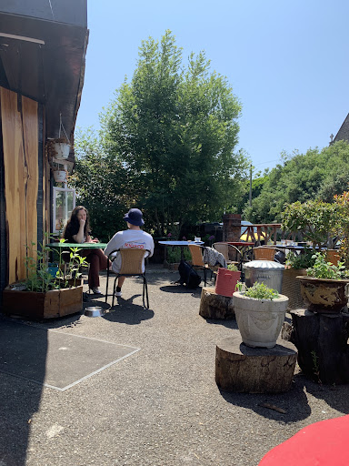 Very interesting place - firstly the location which is in the middle of a suburban part of Brighton and Hove up on a hill near Dyke Road. It's on a corner and because I suppose it is also their house with the downstairs converted to a shop it gives it a pleasant homely feel. There's a largeish garden at the front with an rather striking wooden structure too which I think would be useful in wetter or colder weather than there was on our visit. There's some indoor seating but not much I think - there's also a toilet inside.
