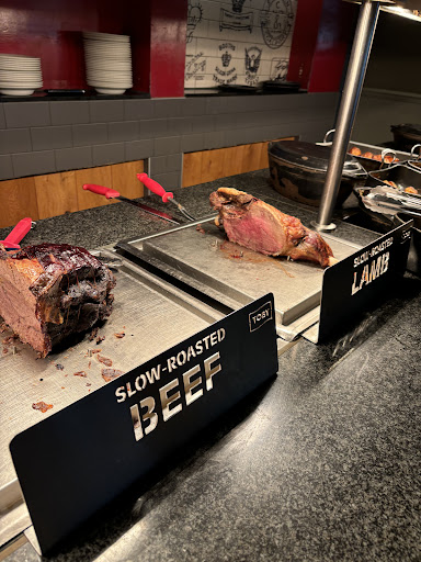 We then waited another 5 minutes for the chef to appear. He briefly poked his head out before disappearing again, and when he finally started building my plate, he didnāt even have a knife to carve the turkey. While serving, he picked up two sausages with a set of tongs, dropped them onto the remains of some mystery meat, then picked them up again and still gave them to me.